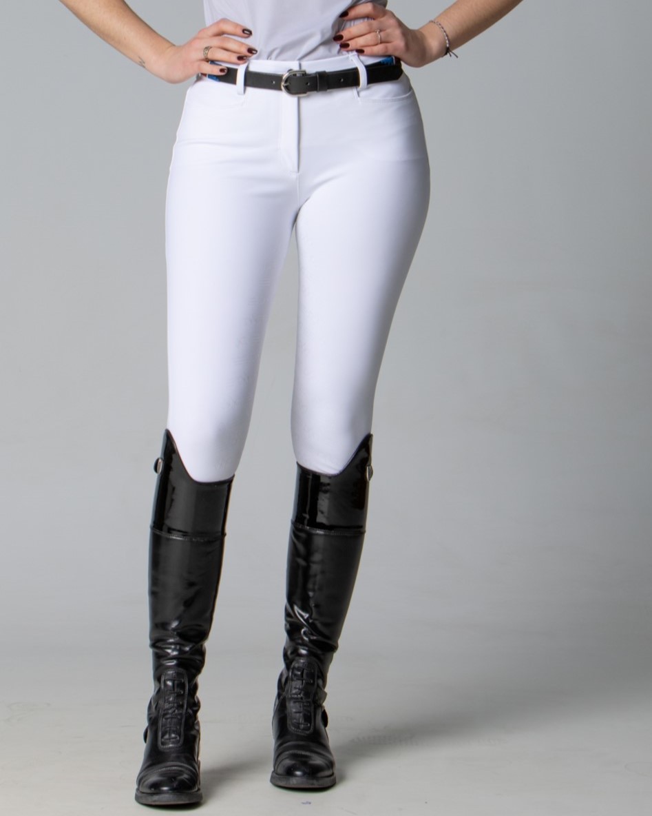 I pantaloni per equitazione FULL nascono dalla fusione dei due modelli KORA, dal quale acquisisce il tessuto e KENZIA, dal quale prende lo stile.