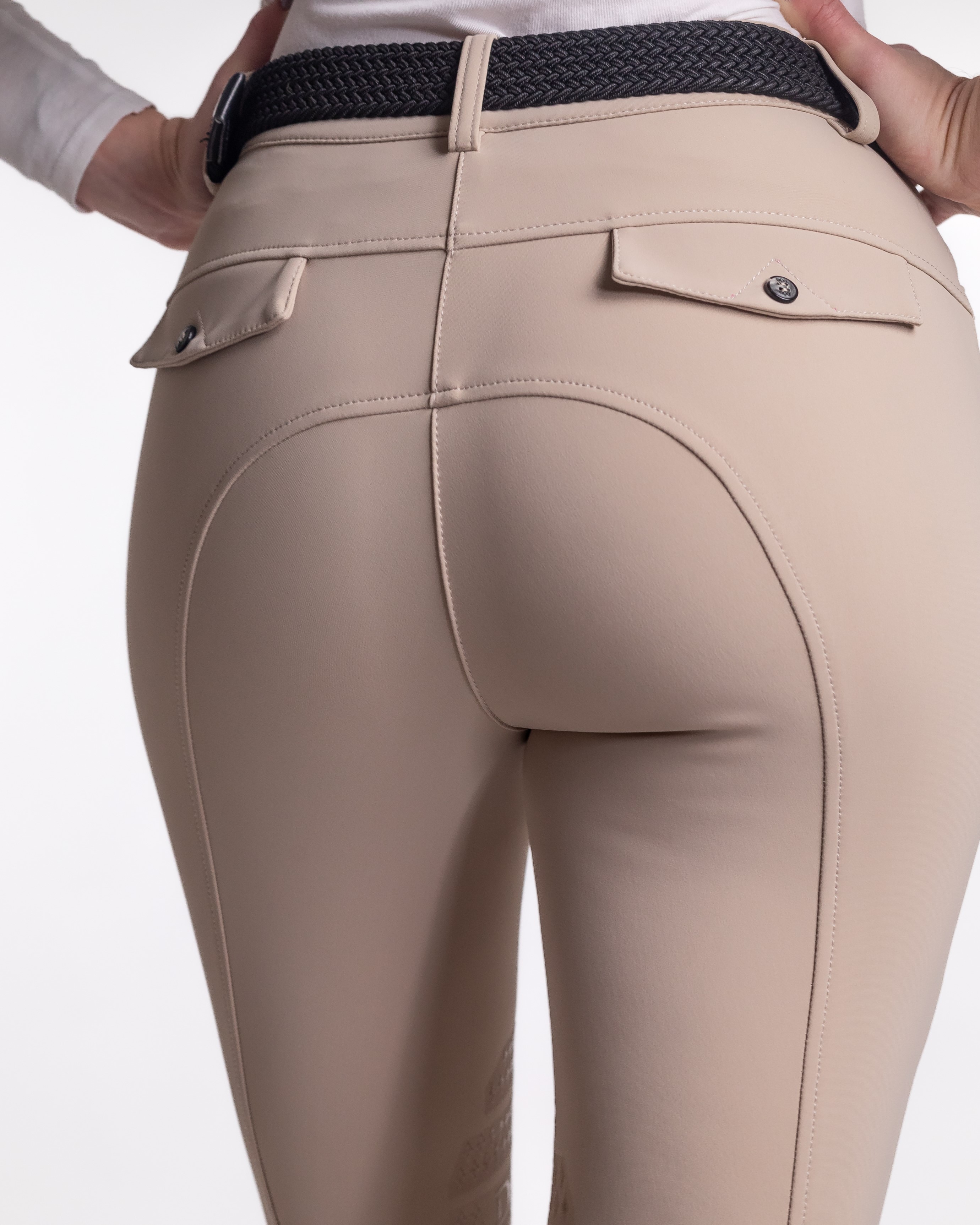 two-way stretch - silicone grip - 2 front pockets - 2 back faux pockets with flap – elastic waist with 'stop shirt' silicone grip – buttons with logo